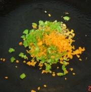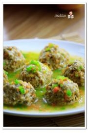 加入适量的淀粉,继续搅拌。搅拌好后,用勺子把肉馅团成圆圆的丸子,水开后,放在蒸锅里蒸15分钟。蒸丸子的过程中,我们再开始一些青椒和胡萝卜碎末,呆会要用哦。