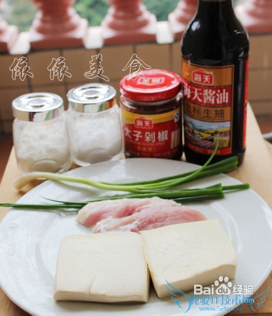 豆腐2块,猪肉100克,剁椒20ml,葱1棵