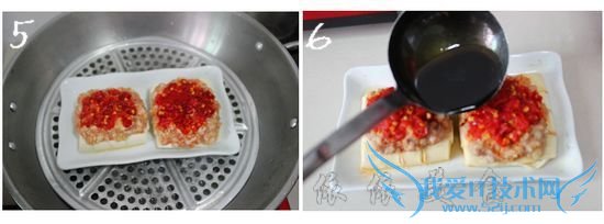 6、把蒸熟豆腐的碟子中的汤汁倒入小锅里,跟调料B一起煮开,淋在