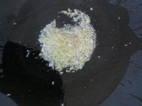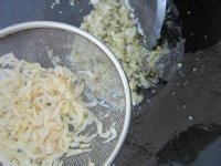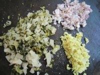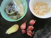 虾皮洗净控水,头菜提前泡上,备好姜和红葱头 把葱头,姜,头菜剁碎