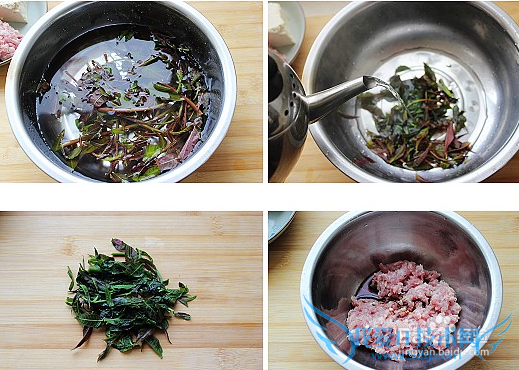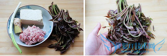 1、香椿清洗干净去掉硬杆,然后用滚热的开水汆烫一下,捞出后冲洗干净沥干水分,剁成细末,