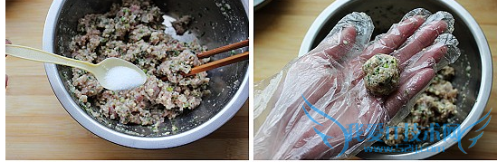 4、拌好馅料后,取一小团放掌中团圆,将做好的丸子放入一盘中备用,