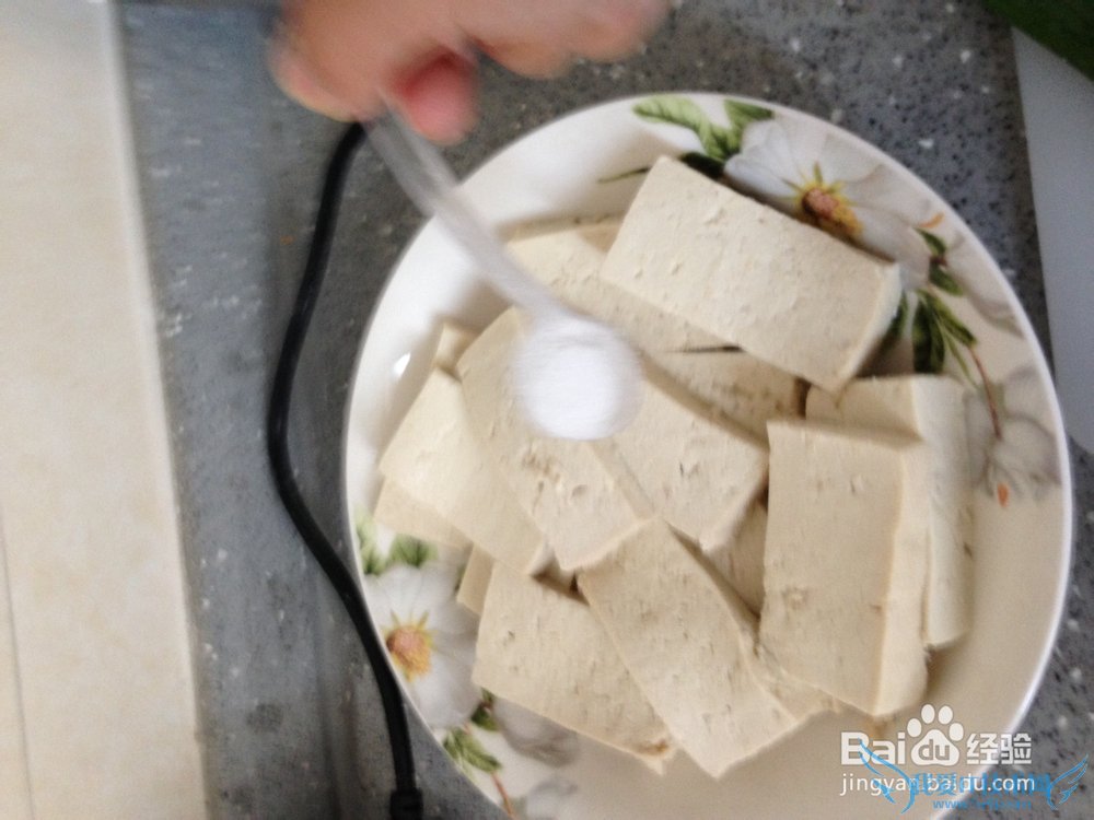 在切好的豆腐上均匀的撒上盐,腌制五分钟左右,然后将面粉均匀的薄薄地蘸在豆腐的表面。