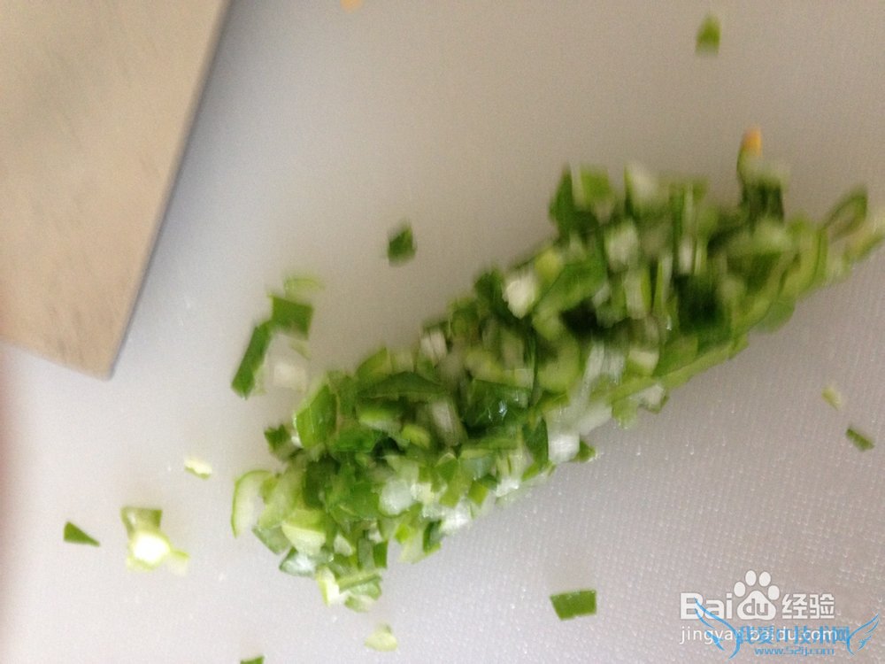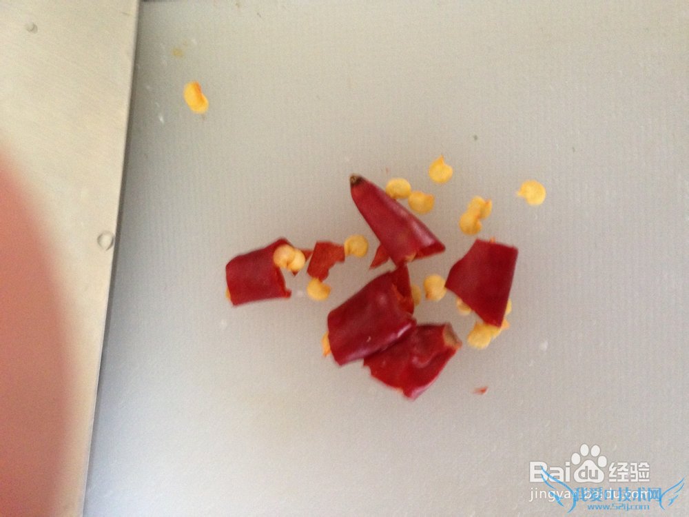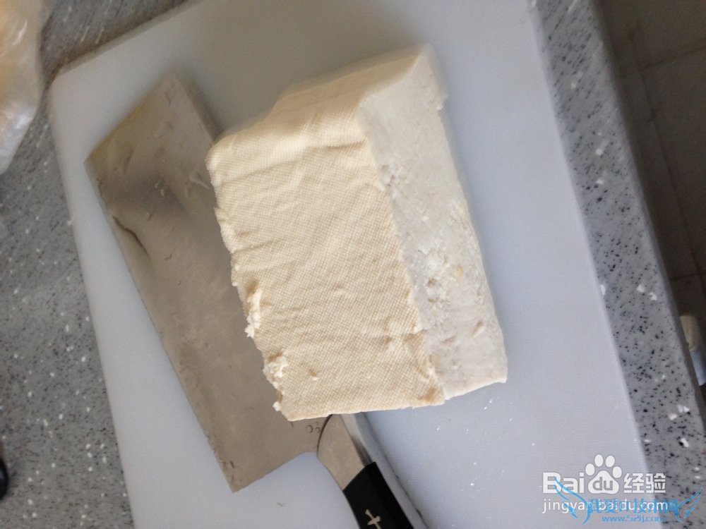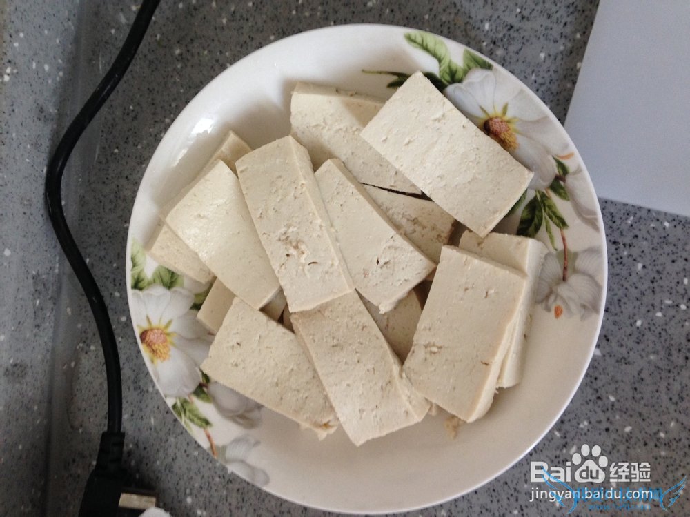 首先将北豆腐切成5厘米长,3厘米宽,2厘米厚的块。香葱切碎,红辣椒切成1厘米宽的圈,大蒜去皮剁成蒜泥。