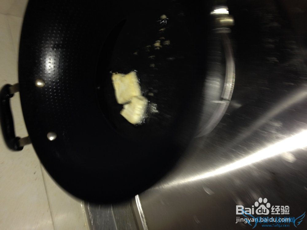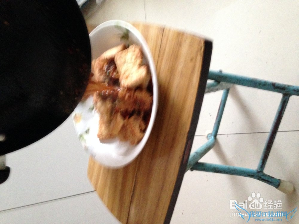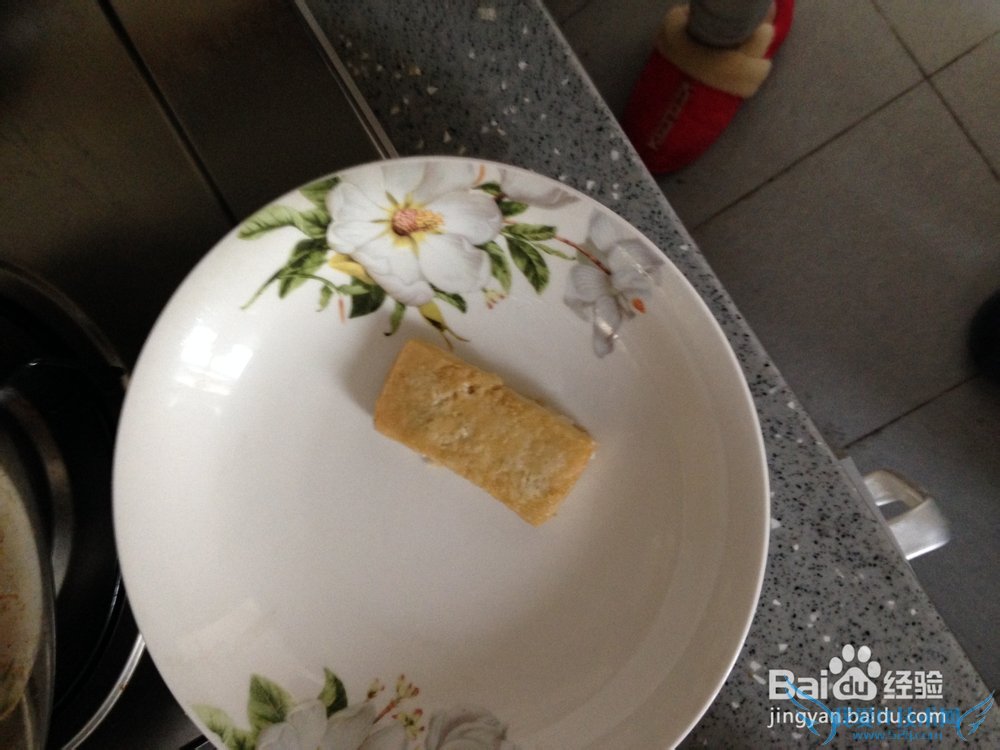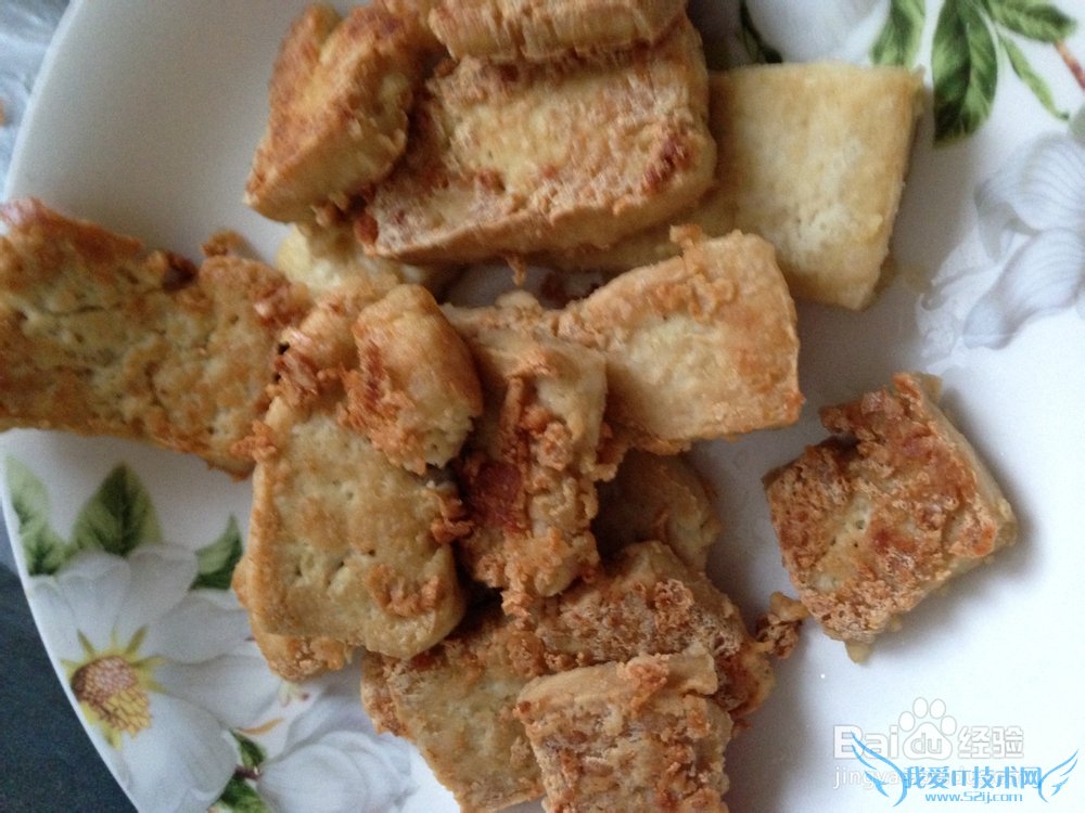 煎锅中导入油,大火加热,待油温四成热的时候,将豆腐放入煎锅中,改成中小火将豆腐两面都煎成金黄色,然后盛出。