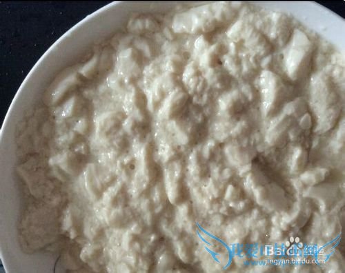买回来后把豆腐放在一个盆子里,用手把豆腐捏碎,捏成碎沫(如下图),捏豆腐的时候你会发现手感特别好,哈哈