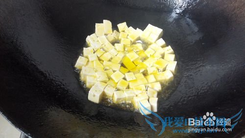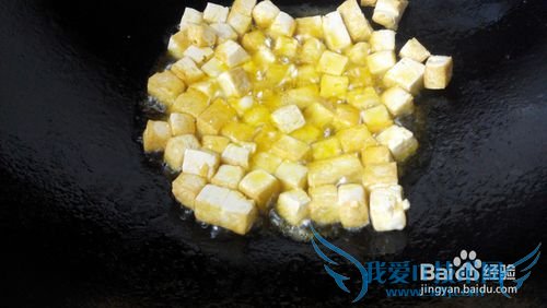 锅中倒油,油温六成热下入豆腐丁煎炒至两面金黄。