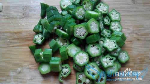 黄秋葵下开水中轻焯,变色后捞出。切成小圈。