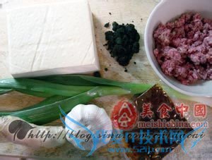豆腐200克、牛肉馅100克、青蒜15克、豆瓣酱20克、豆豉10克、姜10克、辣椒粉0.5克、花椒粉1.5克、酱油10克、盐1克(根据口味)、糖5克、湿淀粉(淀粉加少许水调匀)3克、肉汤(或水)150克、油75克