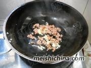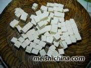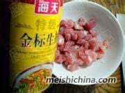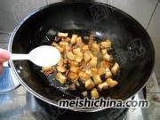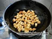 猪肉加入生抽。加入淀粉,拌匀;腌制30分钟。加入淀粉,拌匀;腌制30分钟。豆腐用水冲一下,沥干水分,切小块备用。锅中油热,放入豆腐。