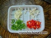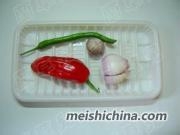 青红椒洗净、去籽,切小粒;洋葱、蒜切细丝备用。