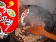 第四步:锅加热,放一点油,把肉末加入,翻炒,至变色,加入姜末,豆瓣酱,继续翻炒,炒香,加水。