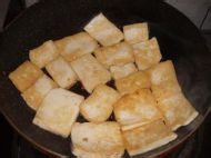 第三步:煎豆腐,把锅预热,加油,把前面准备好的豆腐放入,煎,把二面煎至变黄色,装盘待用。