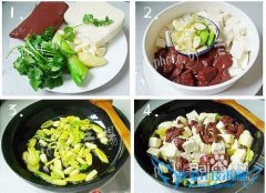 详细操作原料图。豆腐和血豆腐切块,烧开水,先焯豆腐,然后捞出来把血豆腐放进去。放一汤匙料酒烧开。过冷水沥干备用。锅里放油,(最好是菜籽油或者豆油,其他油其...