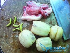 详细操作备好原材料:1·藕(四小节)2·瘦肉(半斤)3·酸辣泡椒(五个)藕削去外皮,切成半圆薄片状;五花肉切成薄片·泡椒对半切开·蒜子切成片;锅置火上,放油...