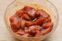 详细操作将羊肉切成小块,烤肉料、水、料酒混合均匀后,将肉码入拌匀,用手抓揉几分钟,然后盖上盖腌渍40分钟。橙子洗净,用尖口雕花刀沿上部四分之一处切出一整圈花...