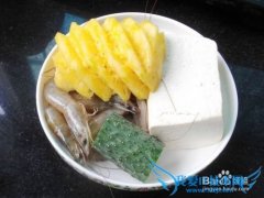 详细操作1.主要材料。2.豆腐切成小方块;3.鲜虾处理好去虾肠虾线,加盐、料酒和淀粉拌匀腌一会儿;黄瓜、菠萝切丁;4.把豆腐裹上一层薄薄的干淀粉,下油锅煎炸至金黄...
