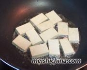 详细操作1豆腐切成三角块,稍厚一点比较好吃,胡萝卜,青椒切菱形块、大蒜切片,小葱切段备用。2锅中烧油,七成热下豆腐片,煎至两面金黄捞出.3倒出煎豆腐剩的油,把肉...