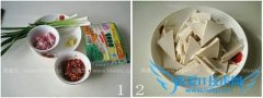 详细操作豆腐切片,五花肉切片、蒜苗切段花生油烧热,放入千页豆腐炸至膨大2倍,表面起泡捞出沥油备用铸铁锅放少许花生油,下姜片炒香放入五花肉炒至发白放2勺蒜蓉剁...