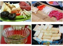 详细操作1豆腐沾上干淀粉入油锅两面煎黄;2在一块煎好的豆腐上薄薄的铺上牛肉馅,再其上覆盖一块豆腐,用水芹丝轻轻绑好;3在锅里分别码上以上准备的材料,注意颜色...