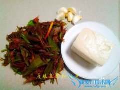 详细操作备齐所有食材:香椿、豆腐、蒜瓣。将香椿叶择去老梗和老叶洗净,锅中放入水烧开,将香椿焯水后,用筷子翻一下,香椿叶变绿,马上将香椿叶捞出。将香椿叶过冷...