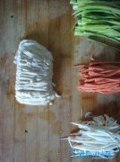 详细操作首先取嫩豆腐,将菜刀用水湿润,菜刀一定要锋利,慢慢将豆腐切片然后切丝,注意手不要被划伤。之后将黄瓜,香肠切丝。将豆腐丝在水中划开,注意不要把豆腐丝...