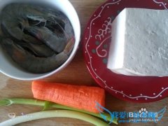 详细操作准备好原材料将鲜虾去头去壳,留虾尾,去掉虾线,清洗干净将挨着虾尾的一小段切出来待用,其余剁碎胡萝卜切出8片待用,其余切成末豆腐切成方块,中间如图掏...