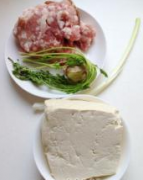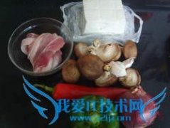 详细操作1.准备所需材料。2.将豆腐切成1厘米的厚块。3.锅内倒入食用油烧至五成热,放入豆腐。4.炸至两面金黄。5.捞起沥油。6.五花肉切厚块,青、红椒切三角形,香菇...