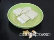 详细操作原料准备好;豆腐用盐水浸泡片刻;大蒜剁碎,姜切成丝备用;平底锅入少许油,入豆腐中小火煎至金黄;翻面再煎至金黄即可盛出;原锅继续入少许油,入姜切炒出...