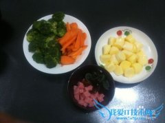 详细操作西兰花掰成小朵,洗净;胡萝卜切片;火腿切小块,皮蛋切小块;日本豆腐切块;锅里加三碗水,煮开下入火腿块煮一会儿,汤中加少许糖,盐,香油,姜丝调好味道...