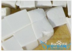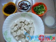 详细操作11、豆腐切约一厘米见方的块,放碗里用沸水烫一下(不能下锅烫煮)后沥干水份,将豆瓣和酱油装一个碗里,蒜苗切碎,豆豉用刀压成茸或剁成细末,将淀粉、味精...