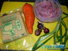 详细操作1原料:五香豆腐干,胡萝卜,瘦肉片,葱棵,葱,八角。2豆腐,胡萝卜,葱颗洗净,切好,瘦肉片用老抽,蚝油,胡椒粉,五香粉腌制片刻。3锅里下油,爆香红葱粒,爆...