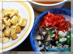 详细操作豆腐一小盒沥水,切块儿,锅热油,用中到大火把它煎黄。干香菇泡水发开,切丝,泡香菇的水留一小碗备用。葱蒜切碎,红椒1/3个切碎。锅热芝麻油少许,倒入葱...