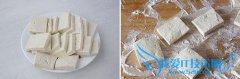 详细操作将豆腐切成0.7厘米左右厚的小方块,放入盘中两面都洒薄薄一层盐,腌制10分钟;将腌好的豆腐片沾上一层干面粉;将1大勺面粉放入碗中,先用少许水和成厚厚的不...