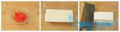 详细操作红彩椒洗净,切丁备用;将嫩豆腐上面的包装纸撕掉,倒扣在菜板上,用刀轻轻的将底部切一下。有空气进去后,用手很轻松的就可以把豆腐盒子取掉;刀上蘸水,切...