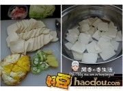 详细操作菠萝买回来以后。取一半的量(留一半做了果酱)切小块。用盐水浸泡一会。嫩豆腐一般水分多。取一个容器盛水压在豆腐上面。这样做可以把豆腐多余水分压出来。二...