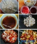详细操作1豆腐切成约1厘米的方块儿,放入加了食盐的开水中浸泡10分钟。2十分钟后,豆腐控去水分,西红柿切丁,准备番茄酱备用(不是沙司)。3番茄酱中调入糖、白醋、...