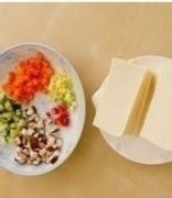 详细操作北豆腐洗净切片。黄瓜、香菇、胡萝卜分别洗净切丁。木耳、火腿切丁。将香菇、胡萝卜同洗净的玉米粒放入沸水中焯一下,捞出沥干。锅烧热,加少许油摇匀,豆腐...