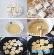 详细操作将豆腐切成0.7厘米左右厚的小方块,放入盘中两面都洒薄薄一层盐,腌制10分钟将腌好的豆腐片沾上一层干面粉将1大勺面粉放入碗中,先用少许水和成厚厚的不流动...