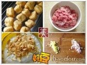 详细操作1猪肉末加上盐、糖、味精、油、淀粉、姜蓉、葱头碎,搅拌匀;再加上虾皮拌匀备用;2用小半碗清水,加入生抽、蚝油、鸡精,搅匀成调味汁,备用;3油豆腐稍微...