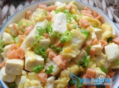 详细操作主要原料豆腐大约200克,鸡蛋3枚豆腐放入蒸锅大火蒸透。(大约十分钟)蒸好的豆腐片去老皮,切成一厘米见方的丁。鸡蛋打入碗中,加入食盐。加入食盐的鸡蛋打...