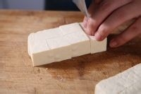 详细操作1先把豆腐切成小块,用厨房纸吸干水分。2培根也要切成小方块备用。3烧热平底锅将切好的培根放入。4煎至两面焦黄,盛起。5锅里倒入少许橄榄油,将豆腐放入。6...