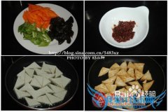 详细操作?做法:1、胡萝卜去皮洗净,和青椒一块切菱形,水发木耳撕小块备用。2、豆瓣酱剁碎。3、热锅上油,油热后放入切成三角形的老豆腐块。4、煎到两面金黄后盛出...
