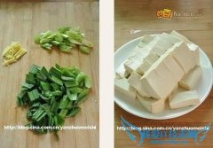 详细操作1切成丝,大蒜斜切成小段,分开蒜白和蒜叶2豆腐切成相等的大小块,用平盘盛装3锅中倒入水,加入1匙盐,(盐的量还是根据自己口味的重和淡来放)4豆腐切小块...