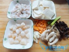 详细操作准备材料,自己做的酸浆豆腐我蒸了一下切片,虾仁用小刀在虾背上划开,取出虾线,虾仁和鲜贝丁洗净控水,大蒜和胡萝卜切片,木耳撕成小块,蟹味菇去根洗净锅...