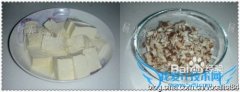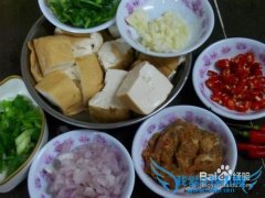 详细操作石膏豆腐开水淋一下,去掉豆腥味,刀切成小丁。撒上一些盐,腌制5分钟即可。新鲜香菇两个,去掉蒂,切成小丁备用。郫县豆瓣酱是主要的调味料。用半勺子。喜...