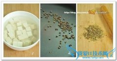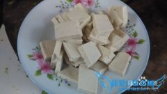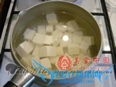 详细操作11、豆腐切大小致的小方块,放入盐开水中浸泡10分钟(也可放入锅开水锅中,加少许盐,倒入豆腐,水没过豆腐,关火,浸10分钟)-----豆腐入盐水既可入味又可...