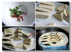 详细操作1豆腐洗净后揩干水分;辣椒、葱切小粒状待用;用小刀将豆腐对角切两刀,改刀成四个小三角,在三角豆腐顶端往下切一条缝,不切到底;用筷子取橄榄菜往三角豆...