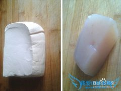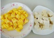 详细操作准备好新鲜的妖芋和南豆腐备用。把准备好新鲜的妖芋和南豆腐切成如图片中的大小备用。注:南豆腐千万别切太小,因它太嫩,容易碎,要么影响口感。提前煮好入...