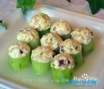 详细操作把黄瓜去皮切段,挖空中间的部分做成黄瓜盅;胡萝卜、鲜香菇、葱切末,将一小块豆腐捣成泥,加胡萝卜、鲜香菇、葱末,调入盐、胡椒粉、芝麻油、素易鲜、少许干淀...
